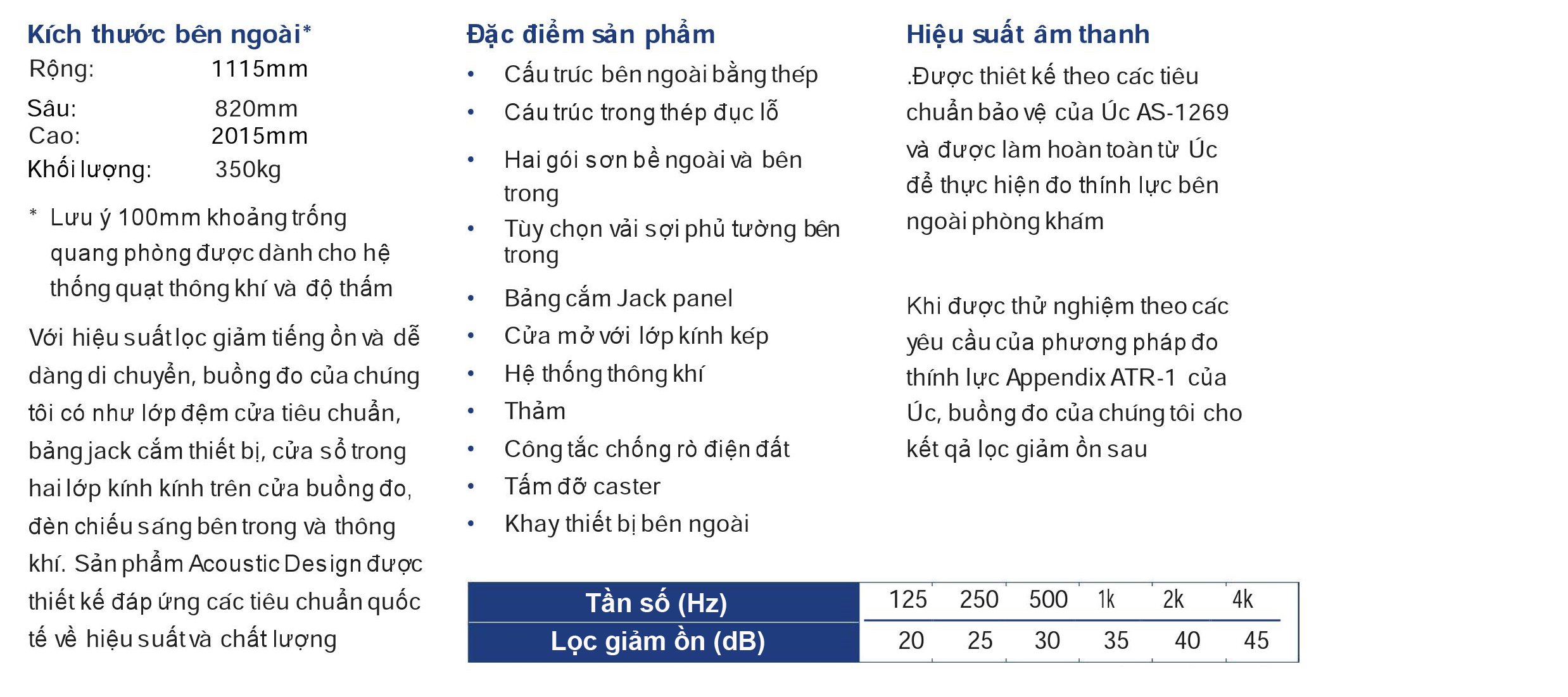Không vấn đề! Buồng đo thính lực Mini của chúng tôi chỉ khoảng hơn 1,5m2, nhưng lại cho cảm giác rộng rãi bên trong. Thiết kế loại bỏ tiếng ồn tốt, buồng đo của chúng tôi được dùng để tầm soát trong môi trường công nghiệp và kiểm tra sức nghe ngoài dịch vụ